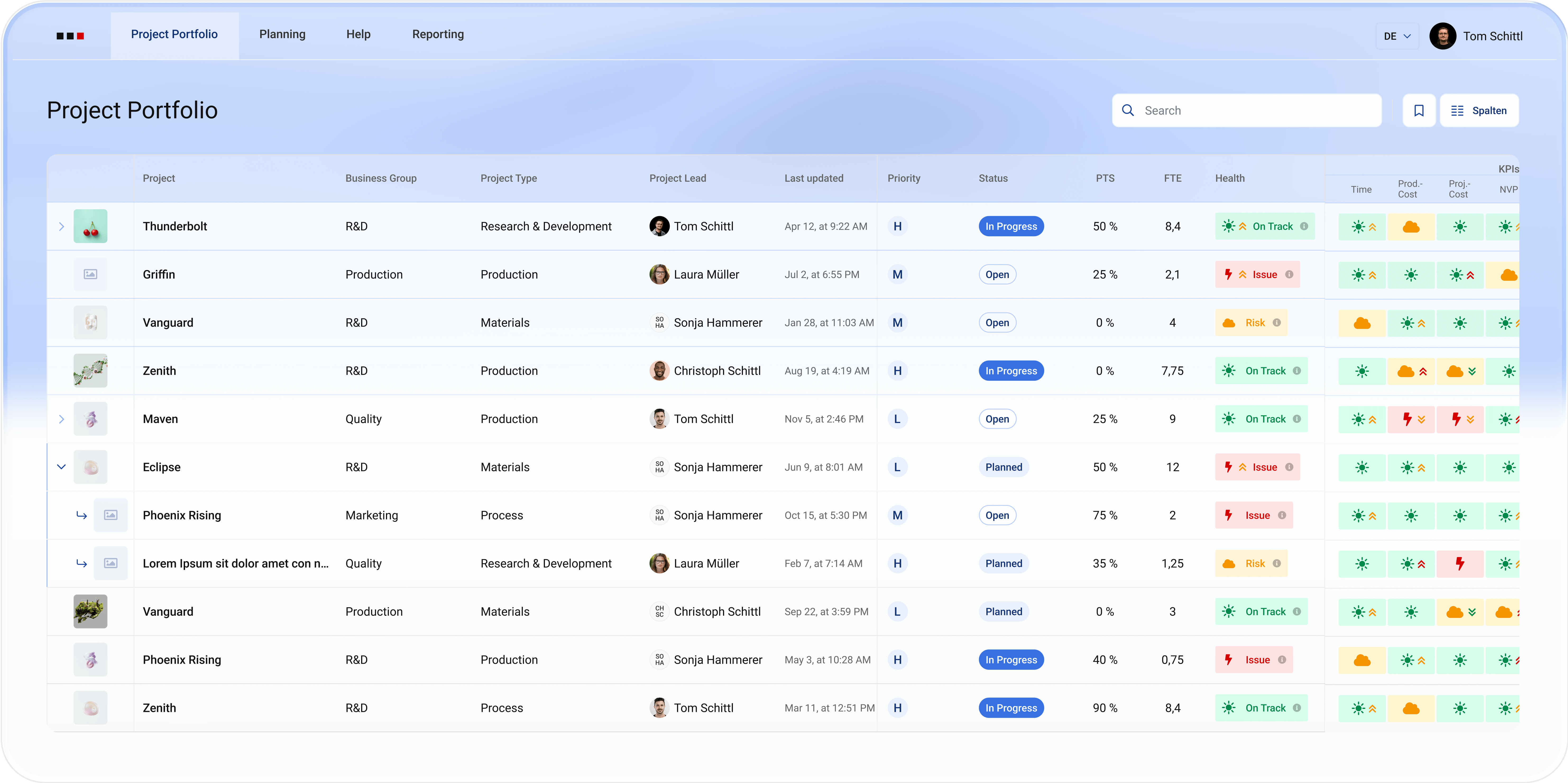 ALEAS Projects vereint Strategie, Portfolio, Ressourcen und Projekte in einer Plattform: Transparent und intuitiv für Entscheidungen, die Wirkung zeigen.